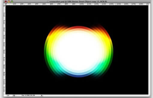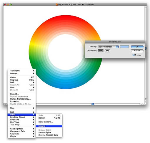 选择混和工具(W) ,点一下白色圆,再点下彩圆,就可以创建一个白圆到彩圆的混合渐变效果。再双击混和工具的小图标,在弹出的选项面板中,把间隔选为指定步数,值为7。