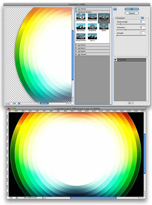 选中合并后的层,打开滤镜 > 画笔描边 > 阴影线,描边长度为 9 ,锐化为 6 ,强度为 1 ,确定。这样做会让图像更具有质感。