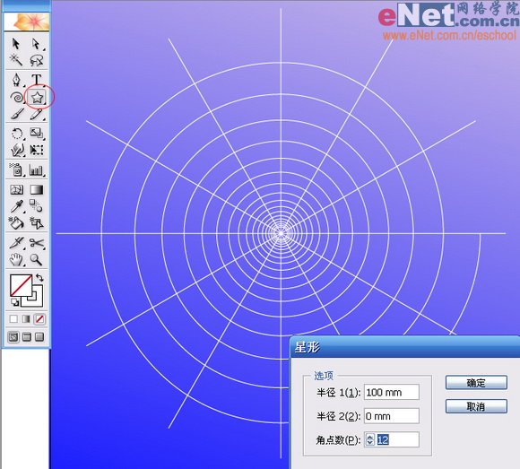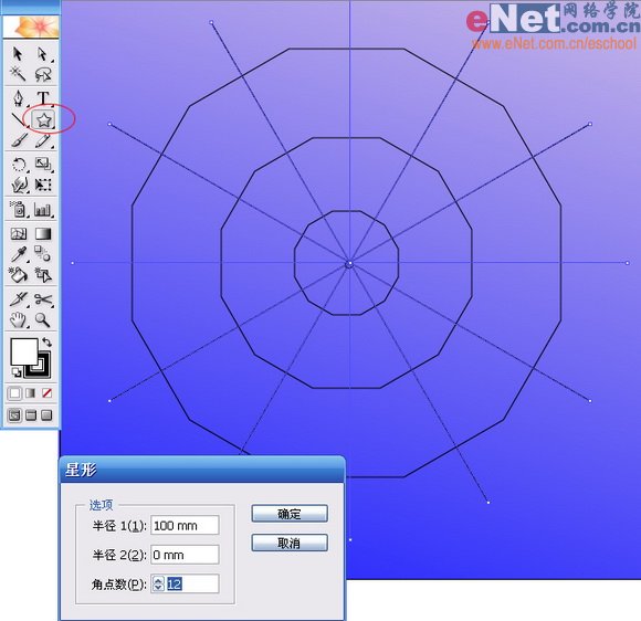 (18)选择“星形工具”绘制星形,参数半径1为100mm,半径2为0mm,角点数为12,点击确定。