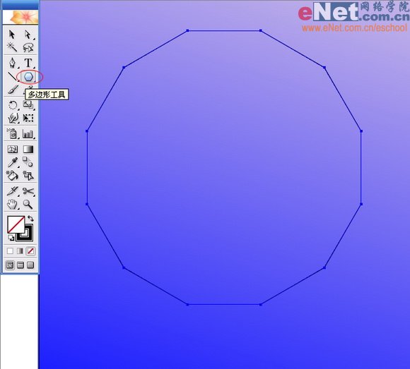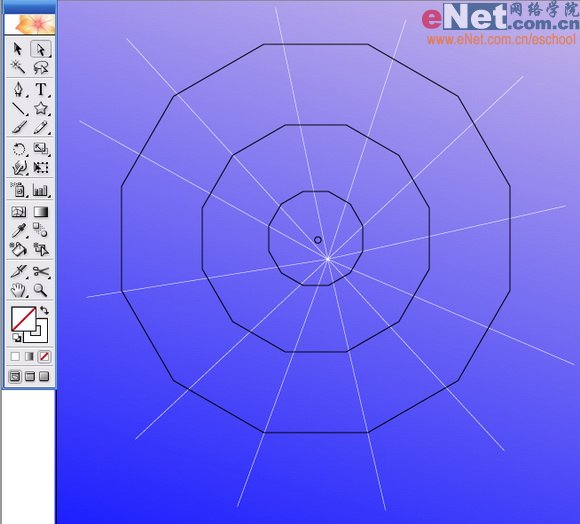 (3)首先来制作第一种蛛网,先在绘图区建立一个矩形作为背景,填入渐变色并将其锁定(菜单“对象>锁定>所选对象”)然后选择工具栏里的“多边形工具”(按住“矩形工具”按钮不放,在弹出的工具条里选择“多边形工具”)绘制一个大小适中的12边形(100mm左右)
