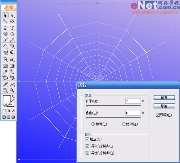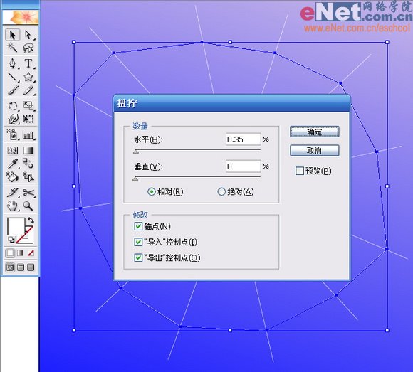 (8)在4个12变形(纬线)全部选择的情况下选择菜单“效果>扭曲和变换>扭拧”,弹出扭拧对话框,设置“水平”为0.35%,“垂直”设为0%,其余设置默认,点击确定。