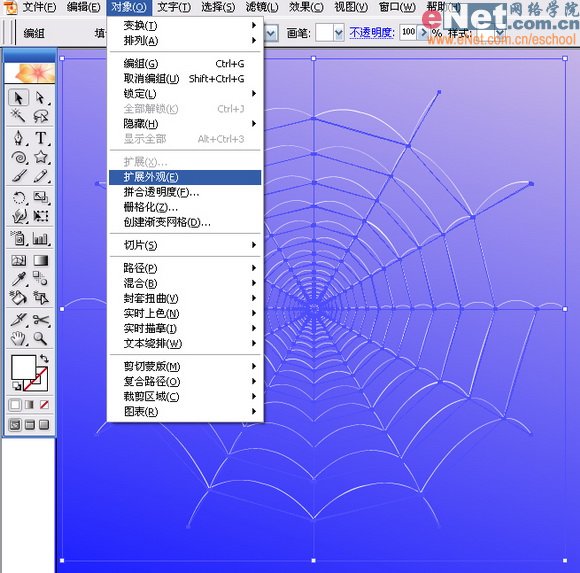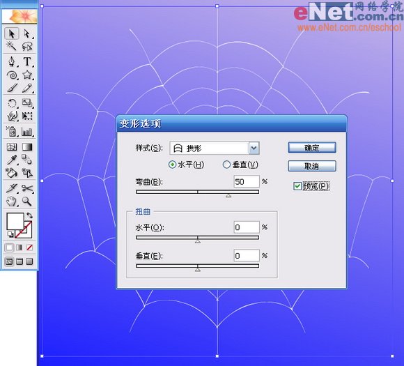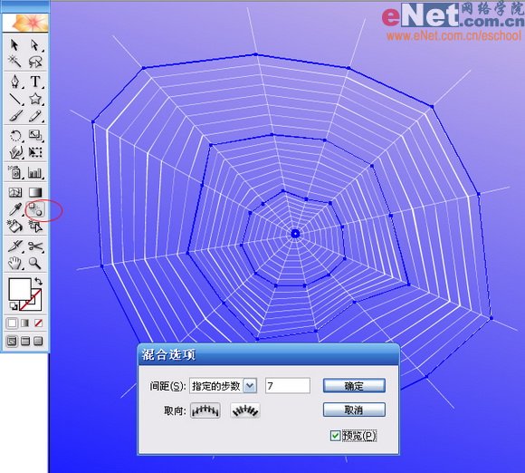 (11)多数蜘蛛网没有那么稠密,双击“混合工具”,在弹出的混合选项对话框中将“指定的步数”设为7左右。