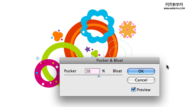 Illustrator里也有好多隐藏的功能,我深深的感觉到我只是懂它的一部分,这也许由于我已养成的习惯造成思维局限,如果你在版本3的时候就用他的话你就知道我说得是什么了,探索新用法和技巧是有益的,可以寻找到更快更灵活的做法,今天脚本之家要讲得是收缩和膨胀效果。
