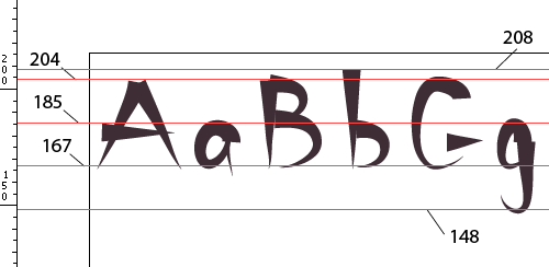 一点点数学 注意你每条辅助线的位置,把它们的数值记下来,我们将把它们汇总起来做一点小小的计算。有一个基本概念:Fontlab 采用 UPM (Units Per eM/元素单位)这个术语来测量字体,然后我们必须想办法把你在 Illustrator 中使用的任意一种单位转换成 UPM。首先我们要在 Illustrator 中测量“元素方块”(你的字体中从下降部到上升部之间的距离)。本例中的元素方块为 60 毫米,因为上升部是 208,下降部为 148,两者之间的距离是60。紧接着,我们继续测量其余的垂直度量在 Illustrator 中的单位数值。