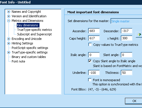 现在我们该新建一个 Fontlab 文件了。新建,然后在文件菜单中选择“字体信息”,展开“度量与尺寸”节点,点击“关键尺寸”选项,设置上升部、下降部、大写高度、x-高度的数值,本例中为 683, -317, 617, and 300。