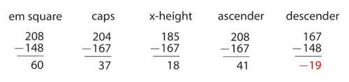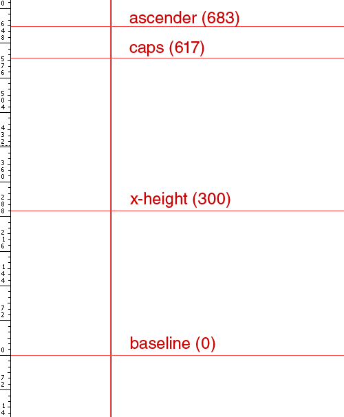 现在,你可以依照我们先前计算出的数值来放置其他的辅助线了:上升部、大写高度、x-高度。