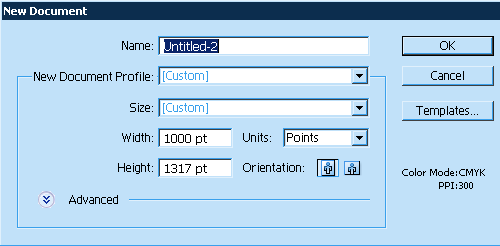新文档 这些数值将成为我们新建 Illustrator 文档中的辅助线高度,我们将在这个新文档中将字形从 Illustrator 复制到 Fontlab。好了,我们新建一个 Illustrator 文档,单位是磅(points),高度是 1000 加上你下降部的高度。本例中,就是1000 + 317 = 1317。