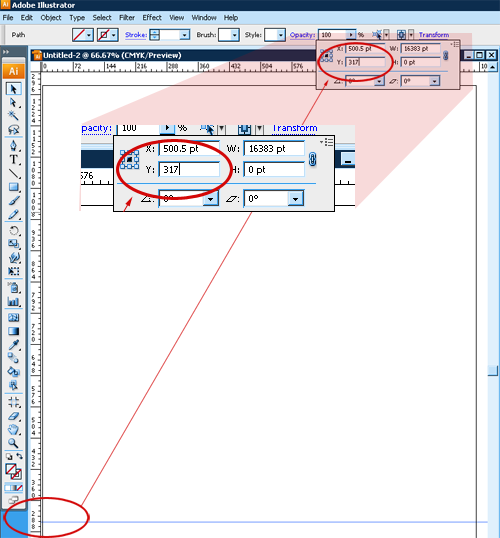接下来,我们得精确的放置辅助线。确定你的辅助线没有被锁定,拖拽一条垂直辅助线靠近你下降部的大概高度。然后选择这条辅助线,点击“变形”按钮,为它设置精确的数值。