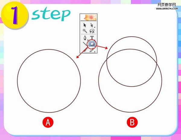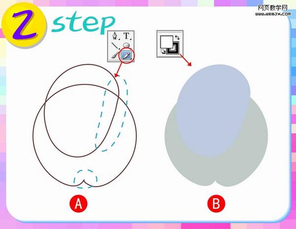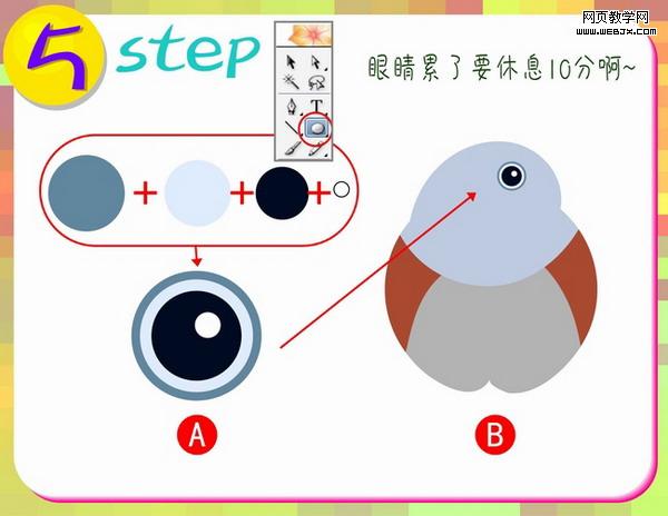第五步:这一步来做鸟的眼睛部分,再次使用工具箱中的椭圆工具,按图中A部分所示进行圆圆相套的操作。(注意最后的白色部分是眼
