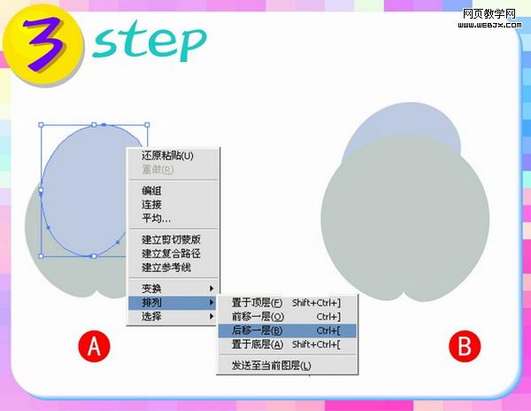 第三步:选中上面的那个部分,点击鼠标右键,出先图中的菜单,选择后移一层如图A所示;图B所示的是这一步操作完成后的效果。