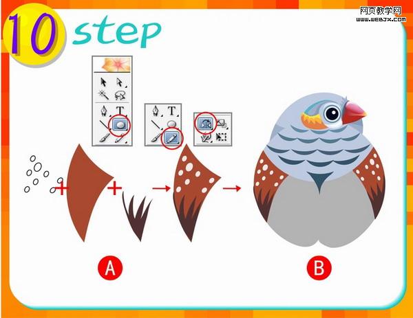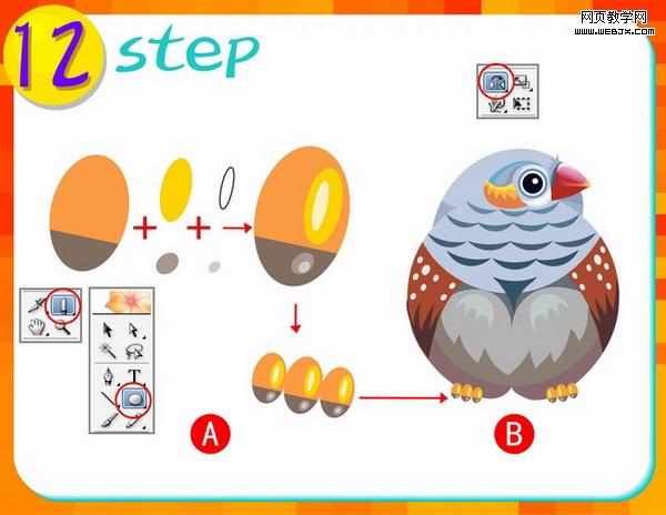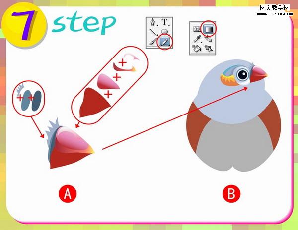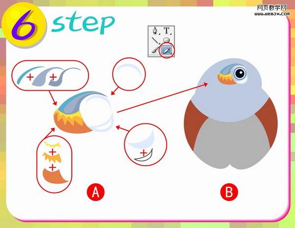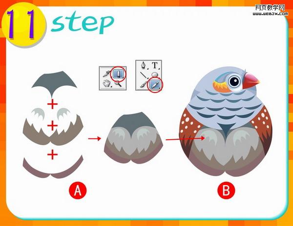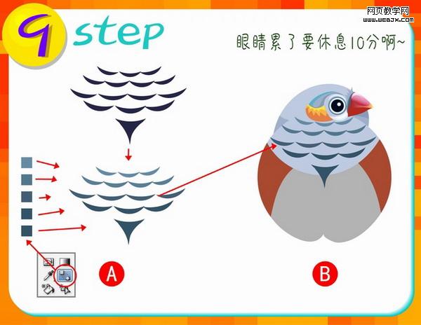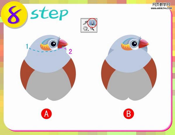 第七步:这一步做山雀的嘴部分,先使用铅笔工具进行图A分布图形的外形绘制,再使用工具箱中的渐变工具进行填色,(注意渐变颜色