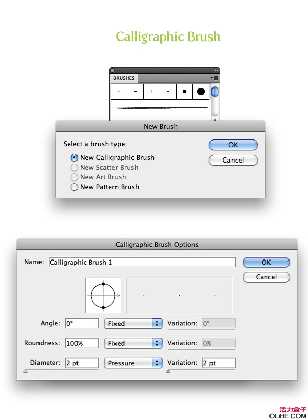 如果你没有CS4,但你有一个手写板,你可以使用毛笔代替斑点画笔(Shift +B)来处理文字的轮廓。如果你有CS3,可以使用实时上色技术或者你可以使用钢笔工具(P),铅笔工具(N)或其他你所选择的工具只创建颜色的形状。要建立一个毛笔设置,使它如本教程中所设置的斑点笔刷一样,要点击笔刷面板中的新建笔刷图标。当新笔刷对话框打开后,选择新的毛笔。在毛笔选项中更改角度为0,圆度为100%,距离为2像素,在尺寸下拉菜单中选择压力,更改变量为2像素。现在你就可以使用与教材中斑点画笔同样的压力灵敏度来描绘图像了。