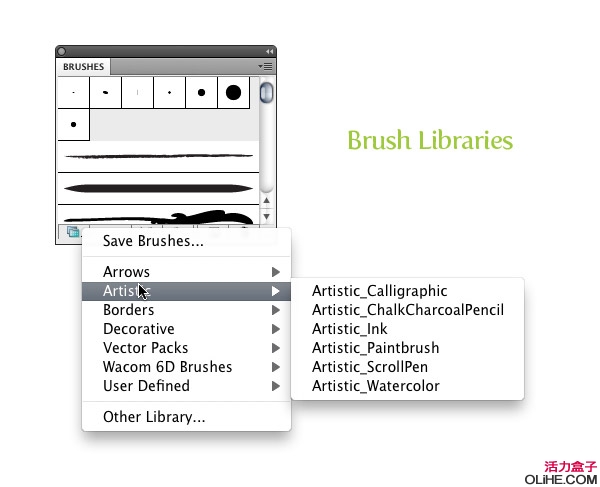 如果你没有一个手写板,你可以随时使用艺术画笔画出轮廓来代替斑点画笔(Shift +B)。艺术画笔有很多功能,但他们不会有手写板的压力灵敏度。不过,你可以找到一个具有类似锥形线的笔刷。