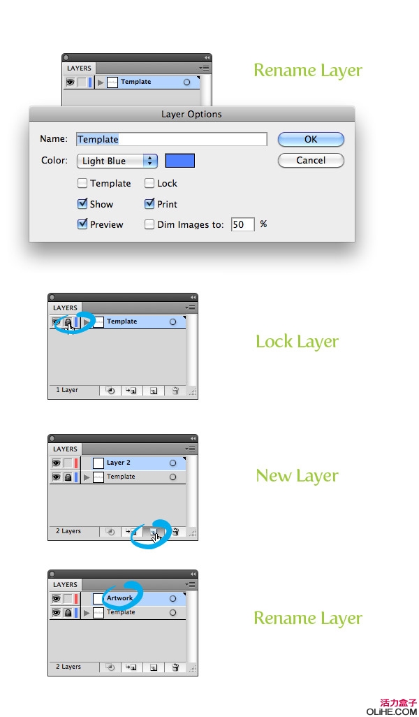 在图层面板上双击重命名你的图层为“Template”(样本),改变图层选项对话框里的名字。下一步,锁定图层。点击图层面板中创建新图层按钮来创建一个新层,重命名该层为“Artwork”(美术作品)。