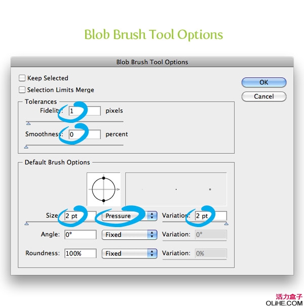 为了绘制外形和处理轮廓,我们将要使用斑点画笔工具(Shift + B)和一个手写板。首先,你需要设置斑点画笔工具(Shift + B)使用压力敏感性。要做到这一点,在工具面板上双击斑点画笔工具(Shift + B)。在斑点画笔工具选项里,你只需要改变:保真度为1,平滑度为0,大小为2,从尺寸下拉菜单中选择压力,并更改变量为2。现在有了这些设置,斑点画笔将能利用手写板的压力敏感性。此外,调整保真度与光滑度创建了一个有手绘感觉的画笔描边。