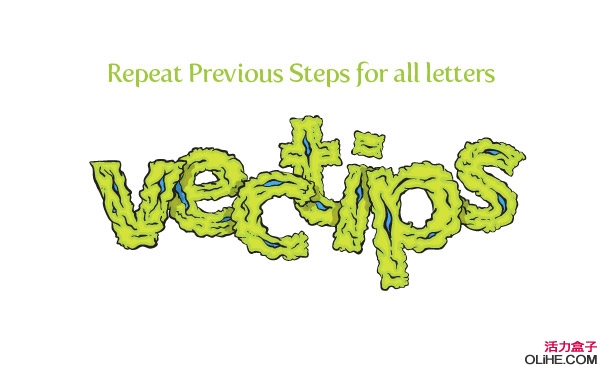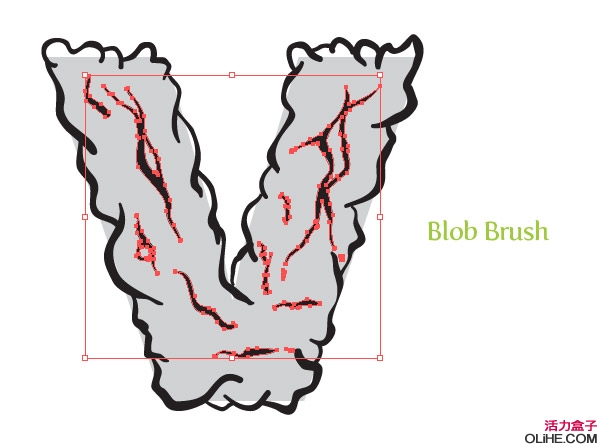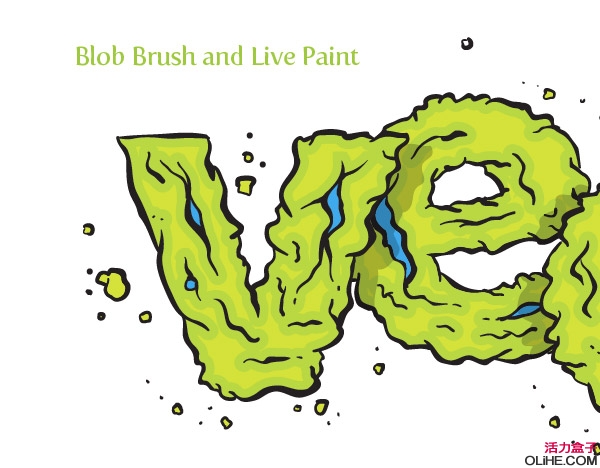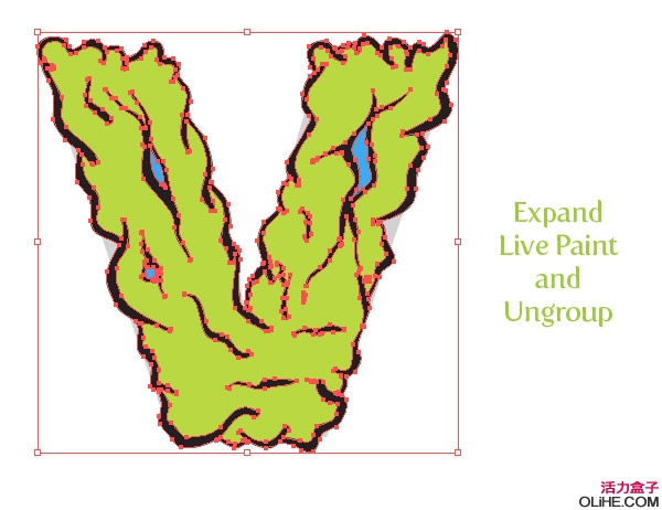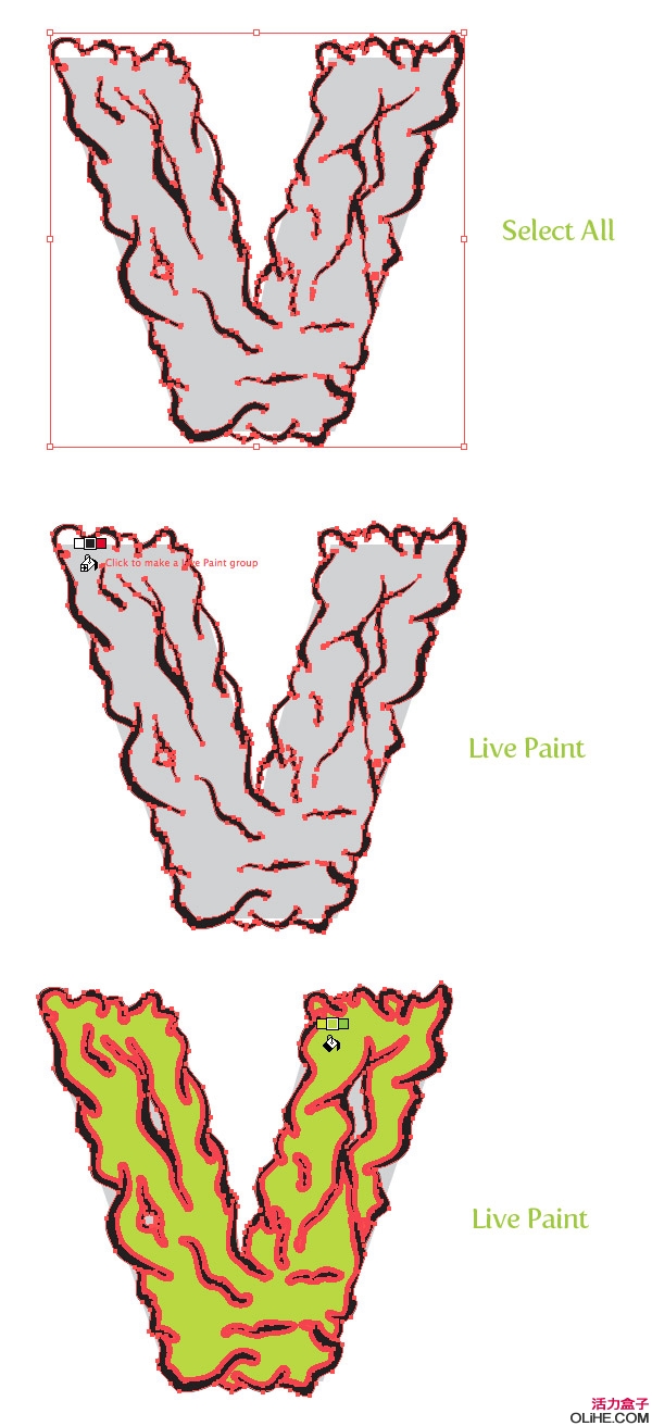 现在,我们有了笔刷描边,我们可以给字母添加一些色彩。首先,选择整个文字,并从工具面板中选择实时上色工具(K)。实时上色(K)的文字转换成实时上色对象。现在你可以填充你想填充的区域,用箭头键切换色板,然后点击区域填充。