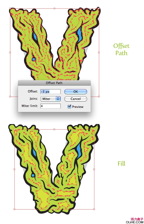 选择你字母的主要颜色,去对象>路径>偏移。在偏移路径对话框中,更改偏移至-3像素。此值可能会放大或缩小这取决于你作品的原始大小。用与之前相同的较浅的颜色填充偏移。