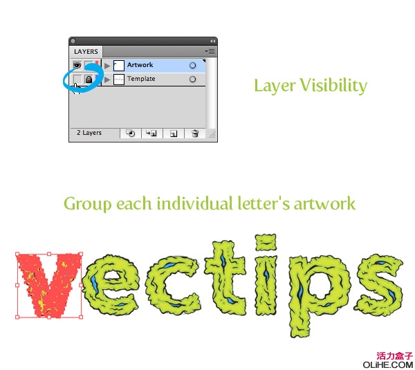 现在,我们做完了所有的字母,我们不再需要“Template”(样本)图层了。只需点击图层面板中的可见图标来隐藏它即可。下一步,组合(Command + G)每个独立的字母作品。这样做容易在以后的步骤中修改。