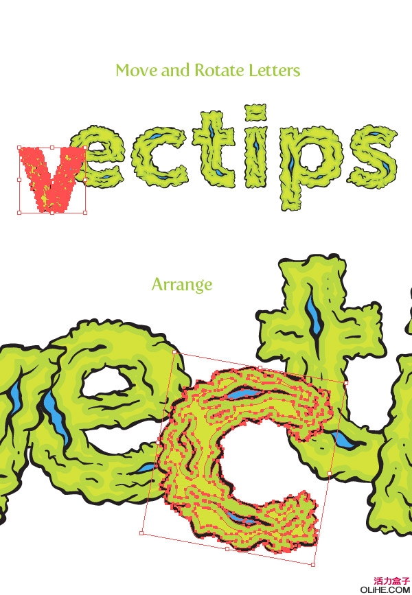 使用选择工具(V)来移动和旋转每个字母。使用Illustrator中的排列功能把一些字母放在前面或后面,对象>排列。