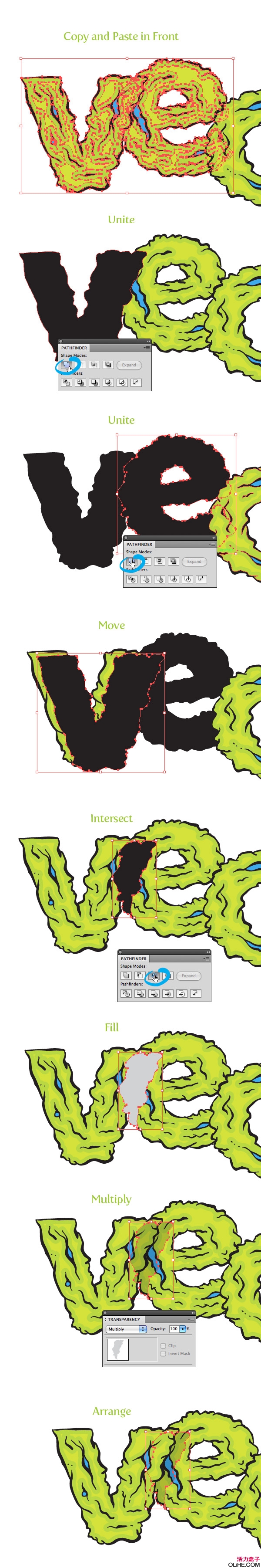 为使处理更加深入一点,我们可以创建一些阴影。首先选择前两个字母,在前方复制(Command + C)和粘贴(Command + F)。选择第一个字母的副本,然后按路径查找器面板的联集按钮。选择第二个字母的副本,并再次按路径查找器面板的联集按钮。选择第一个字母的副本,把它向右下方移动。选择这两个副本,然后按路径查找器面板的交集按钮。更改新形状的填充为浅灰色,在透明度面板上设置混合模式为正片叠底,把这个形状排列在第一个字母的后面,但在第二个字母的前面。好乱啊…