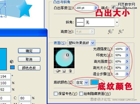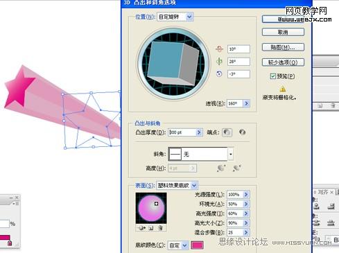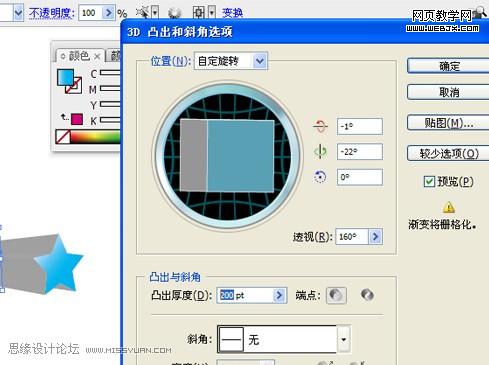 2.执行“效果”-“3D”-“凸出和斜角”,具体数值如下图所示: