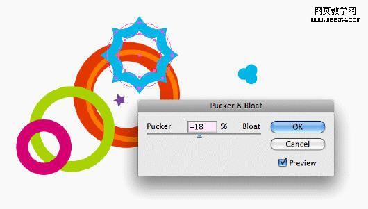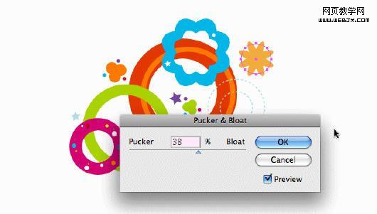 保持环形选中状态,执行对象>路径>添加锚点命令,这样增加环形路径上的节点数。 再执行效果>扭曲和变换>收缩和膨胀命令。