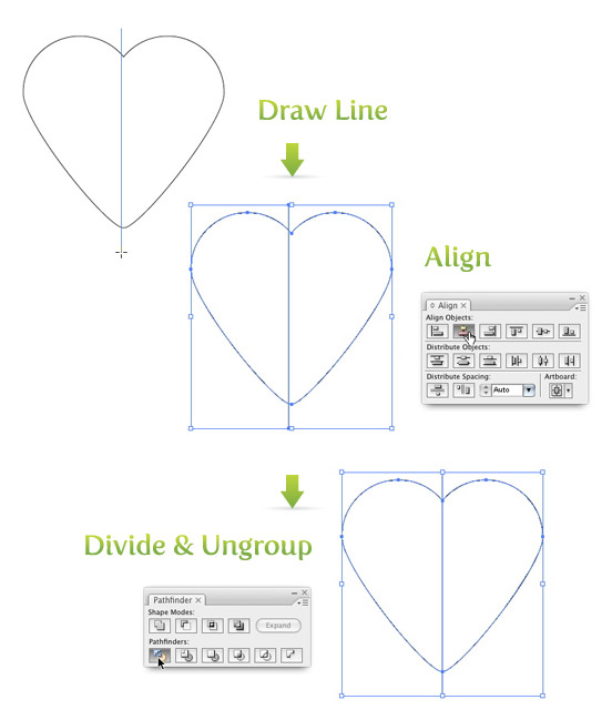 现在有点叶片的样子了,还须加点颜色。填充颜色前,需要把叶片形状切分成两个对象。使用直线工具在叶片形状的中央划条线。全选对象,在对齐面板里点水平居中对齐,然后在路径查找器面板里点分割按钮然后解组。