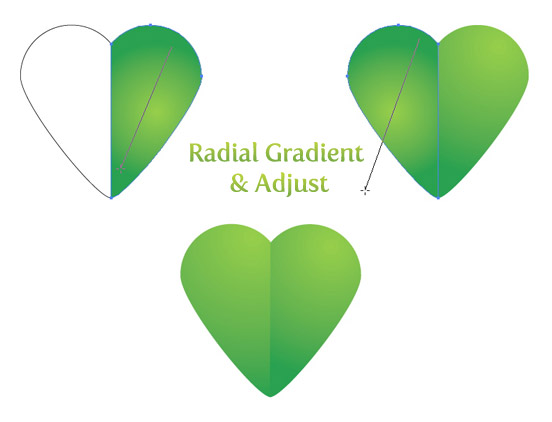 选中其中一个形状,从渐变面板里创建径向渐变。在渐变色板里使用一浅一深两种绿色的色板。使用渐变工具从形状的顶部右侧向底部左侧手拖拽。使用同样的径向渐变填充并调整其它叶片。