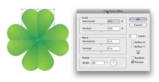 步骤2:变换 一个叶片做好了,我们还须另外三个。以上步骤重复3次就太繁琐了。没关系,手头有变换效果可用。选中两个叶片然后群组。接着,效果-扭曲和变换-变换,弹出变换对话框。在对话框里把副本份数改为3,旋转90度,然后点9点指示图的底部中心点(9点指示图在随机复选框的上面)。现在三叶草有四个叶片了。使用 对象-扩展外观 是个好办法。如果不扩展,下次想要旋转叶片时可能会得到不想要的效果。接下制作三叶草的茎。