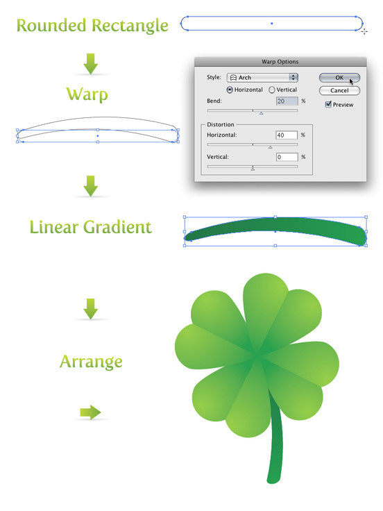 步骤3:茎 使用圆角矩形工具画一个尺寸相当的茎。接着,用 效果-变形-弧形。 在变形选项对话框里。弯曲设成20%,水平扭曲设成40%,其他选项不变。然后,对象-扩展外观。 使用比叶片更深的绿色,从渐变面板里选取线性渐变为茎填充渐变。把叶子和茎旋转到合适位置,打完收工!