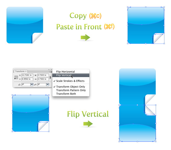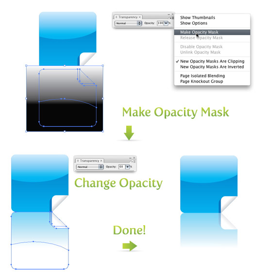 群组(Ctrl+G)所有对象,从透明度面板的弹出菜单中选择垂直翻转。(译者注:在CS 5中没找到垂直翻转,可能已经取消了。没关系,用镜像工具水平镜像一下吧。)