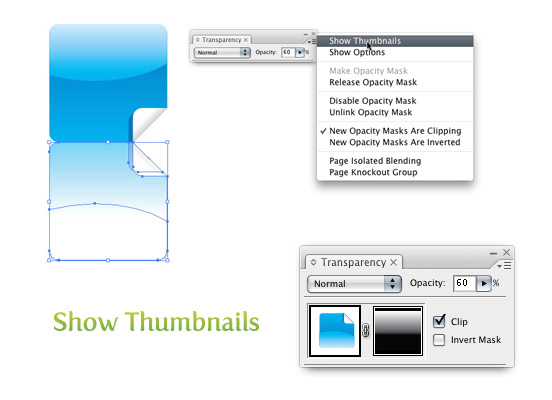 编辑不透明蒙版 如果对制作的反光不满意,还可以回到不透明蒙版重新编辑。在透明度面板的弹出菜单中选择显示缩览图。你也可以从弹出菜单中选择显示选项,只是我从来没用过。如果有读者使用过请告诉我。