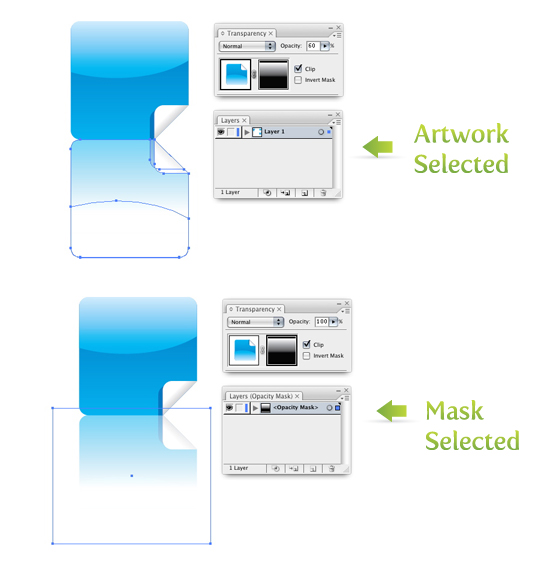 在不透明蒙版中,渐变的白色部分将显示图像而黑色部分隐藏图像。这是理解不透明蒙版基本却又重要的概念。再说一遍,白色显示,黑色隐藏。黑色之间的灰调将变化透明度。接下来,选中矩形和已翻转的图像,从透明度面板的弹出菜单中选择建立不透明蒙版。在透明度面板中把不透明度改为60%即可。