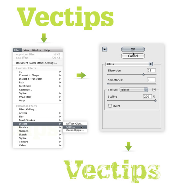 为了产生最佳效果,建议以300dpi使对象栅格化。使用 效果-文档栅格效果设置 并选择 300dpi 。 添加污秽效果 选中文本,使用 效果-扭曲-玻璃 。 在选项中采纳以下设置。 扭曲度:15 平滑度:1 纹理:块状 缩放:200%
