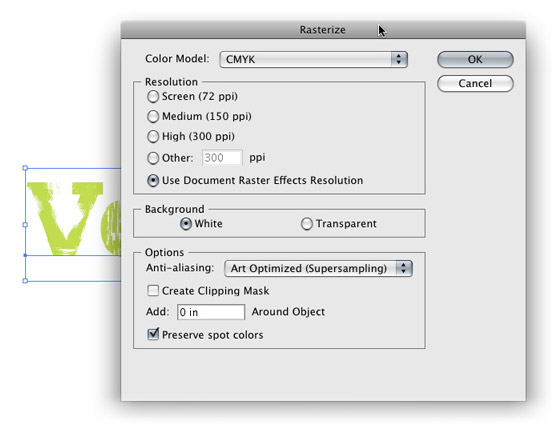 在转换成矢量之前,两个对象都须栅格化。选中污秽文本,使用 对象-栅格化 。除了把分辨率改成与 使用文档栅格化效果分辨率一致以外,其它选项不变。