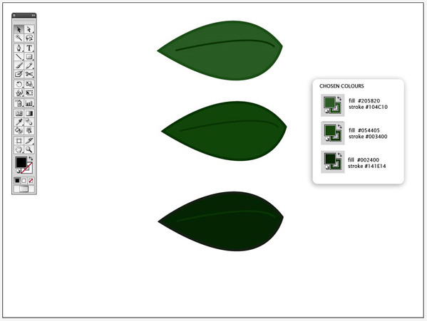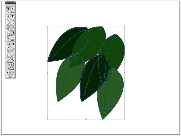 选择钢笔工具(P),并画出叶子的形状。填充形状和路径,并调整到深绿色。