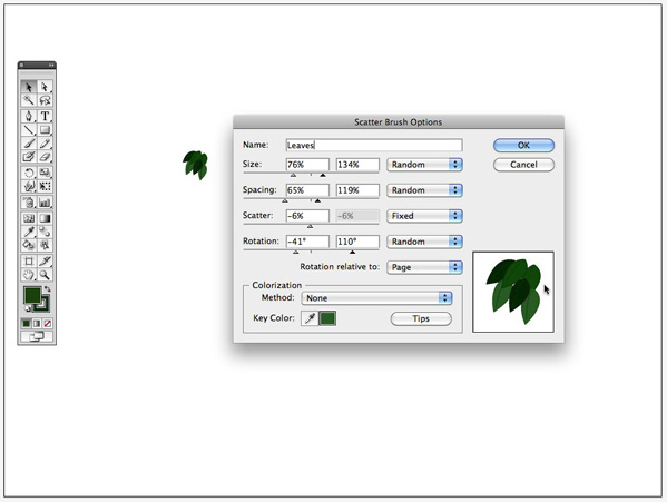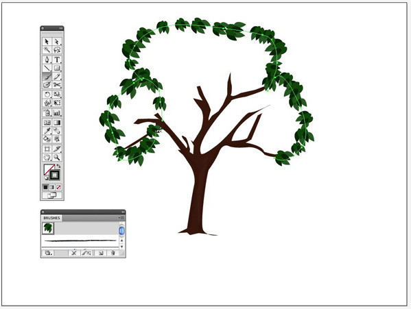 采用笔刷工具(B)。选择你的新叶子笔刷刷托盘。确保填充设置为空。绘制一条置入了树的外线。
