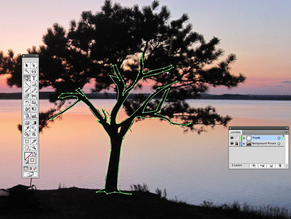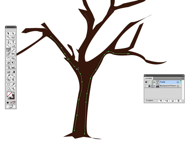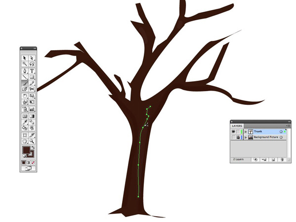 选择钢笔工具(P),然后在“树杆”层开始描绘轮廓。