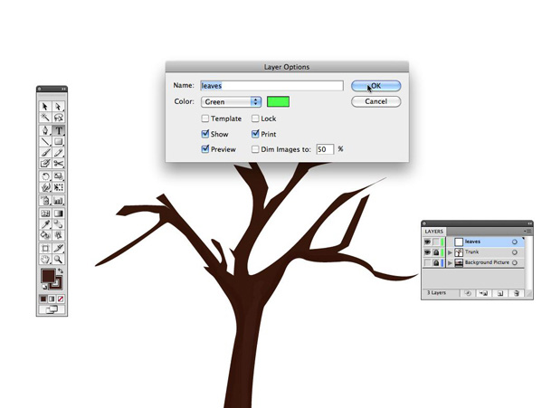 选择所有的树杆部分并群组(ctrl+G)它们,然后锁定这个层。