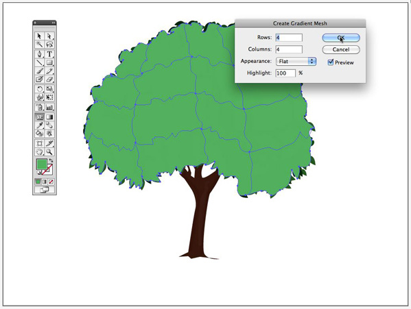 仍然选择物体〉渐变网格工具,检查预览框,设定Rows to 4, Columns to 4, Appearance of Flat, and Highlight at 100%,然后按OK。