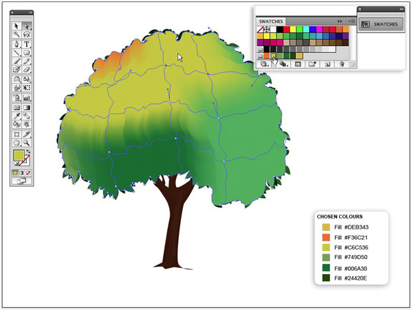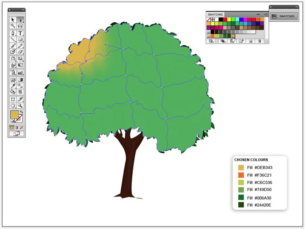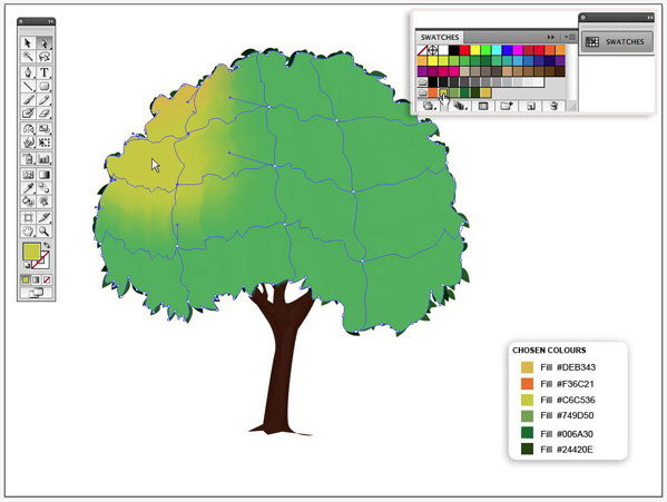 选择渐变网格其它的区域,重复上面的步骤,并且给每一个区域适当的颜色。我已经选择在网格右边置入黄绿相间的高亮阴影,和在网格底部的左边置入深绿色。