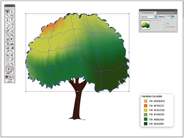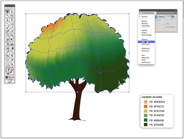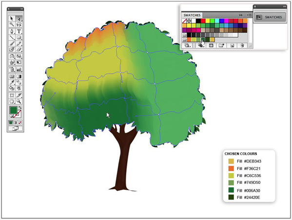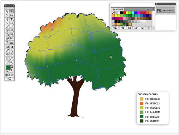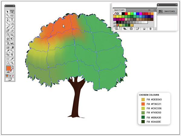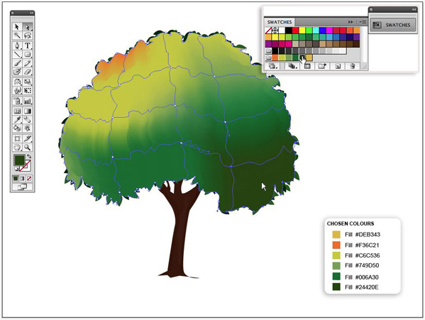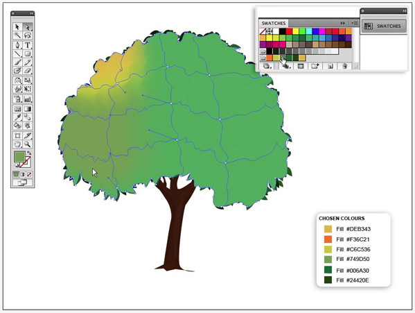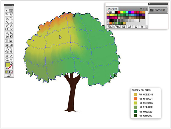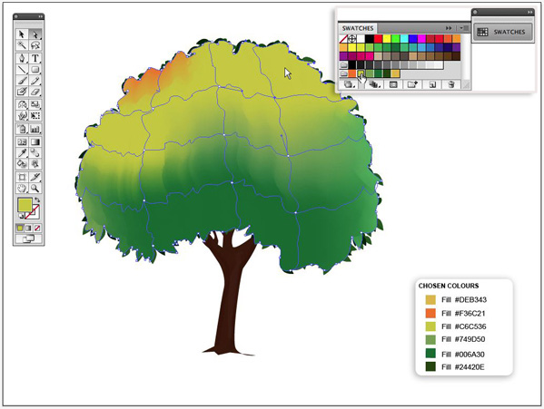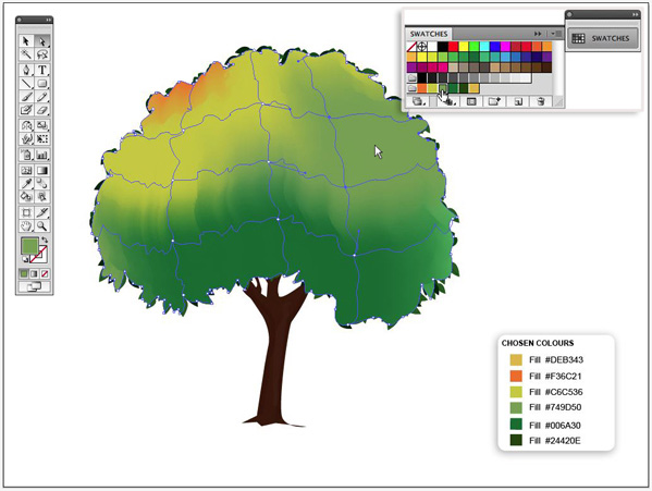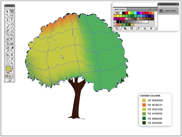 我们现在到着色渐变网格,你可能选择一些基于你的喜好想要的颜色,例如,我将选择树的左边有一些阳光,右边有一些倒影的效果的颜色。