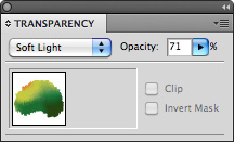打开opacity window (Window > Transparency(透明度)窗口模式,还是选择“柔和光”选项,不透明度设定为71%。