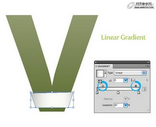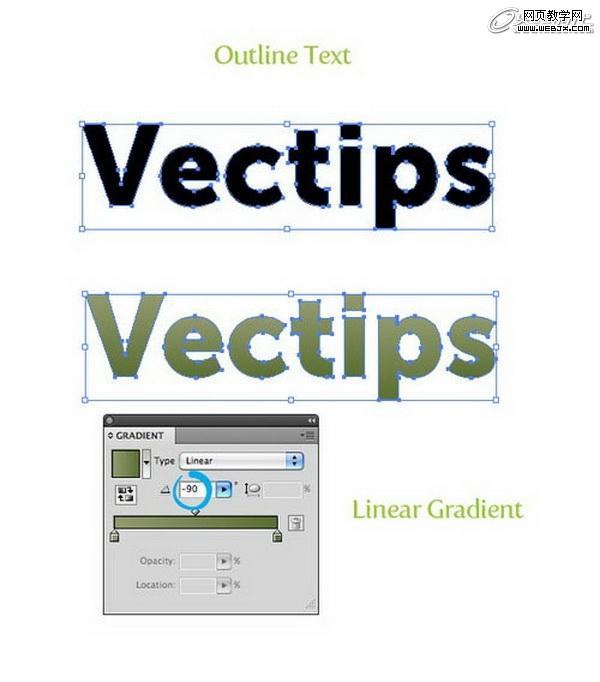 单一色彩无法表现文字的质感,所以我们选择线性渐变填充文字,(ctrl+F9)打开渐变控制面板,我们选择相同颜色的不同明暗度在垂直方向做渐变,以表现文字的明暗效果。在这里还是建议你选择自己喜欢的色彩。(图02)