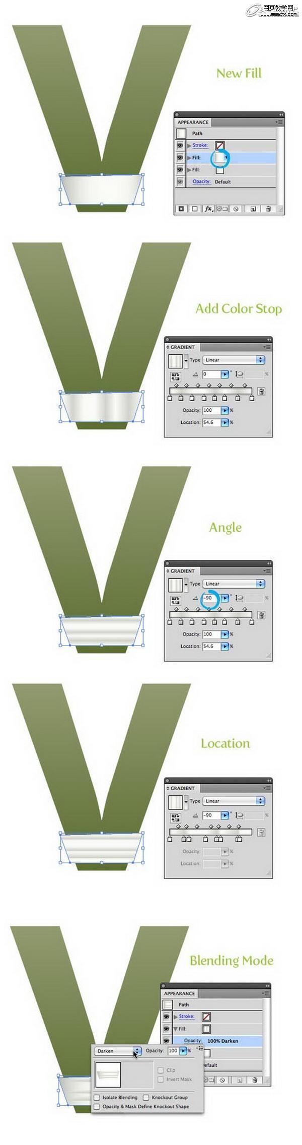 然后我们打开外观控制面板(Shift+F6),新建填充色,请确保新建的填充色在最上层,然后为其填充灰、白相隔6节的线性渐变,总共8个控制点。让我们再为其添充色设置混合模式为变暗。(图05)