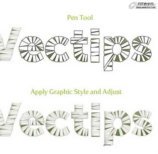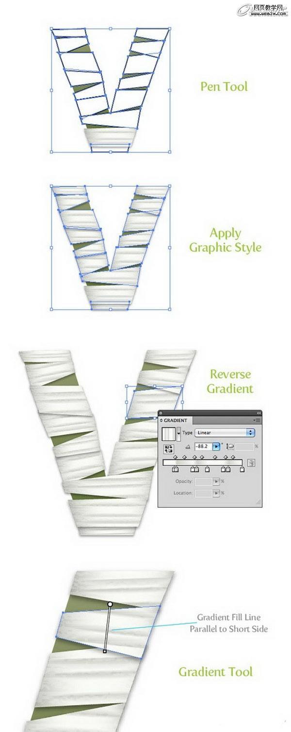 现在我们开始制作其他缠绕在文字上的布料,这一阶段可能是本教程中最枯燥乏味的阶段,完成这个阶段你才会发现其中的乐趣所在。我们依然使用钢笔工具绘制文字上各位置的小块,不过你不需要再为小块添加各种填充色,只需要把我们刚创建的样式添加到小块中。[p=24, null, left]不过在这你需要特别注意下每块布料的关系,如果在这你想象不到每块布料的关系,你可以找块布条在任意物体上缠绕来发现它们之间的关系。还有就是并不是将我们创建好的图像样式添加小块中就意味着做好了一块布料,我们还需要对布料的纹理方向根据其缠绕走向进行调整,我们将调整灰、白相隔为六块的渐变,设置其倾斜方向,这样才能让每块布料看起来更加和谐,和谐射会嘛一切都得和谐!(图09)