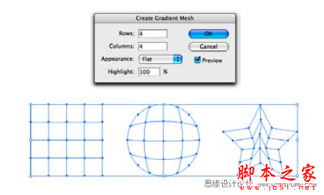 选择一个形状后(非复合形状),从对象菜单中选择创建渐变网格。然后在创建渐变网格窗口中,你可以定义网格的构成-行数和列数。注意:网格线是依据形状的原外观轮廓生成的。