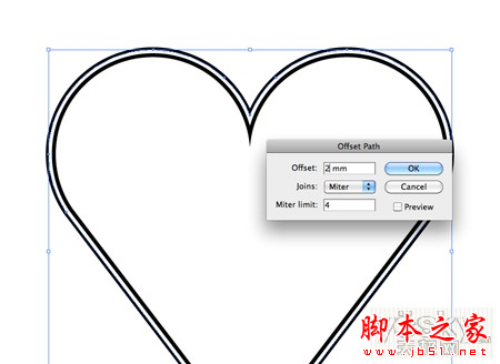 使用Pathfinder工具合并所有的形状,然后点击菜单"对象-路径-偏移路径",设置偏移量为2mm,绘制出心形双线轮廓。