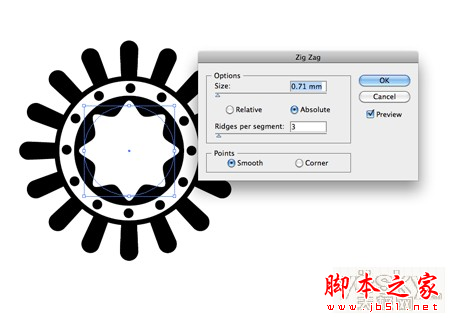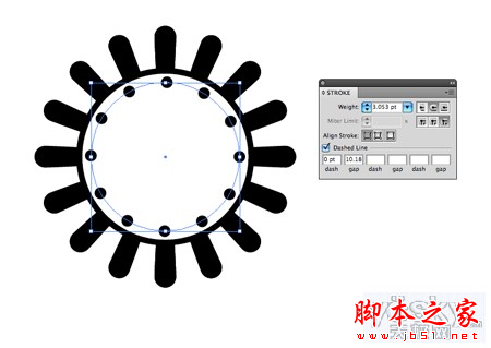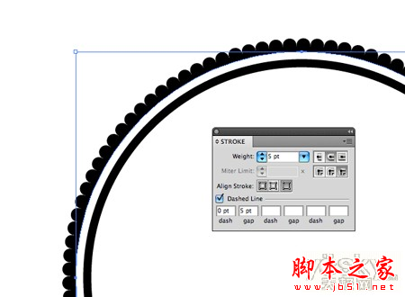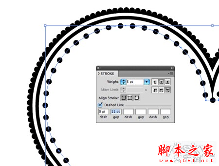 按Ctrl+ C复制,Ctrl+V粘贴轮廓,准备描边,设置宽度为5pt,选择虚线选项,如下图设置数据dash为0pt,gab为5pt,这样我们就能得到一个很酷的波浪边框。