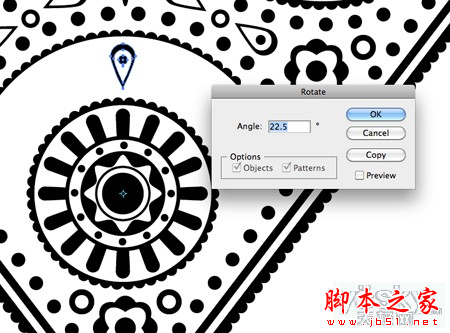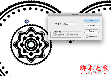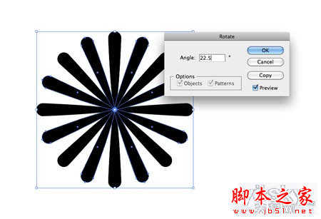 选择刚才绘制好的花瓣形状,转到"对象>变换>旋转",输入角度为22.5度,继续重叠绘制出更细密的图案。